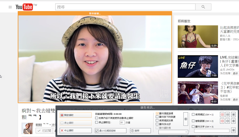 例如要擷取 YouTube 的影片,可用矩形選取影片區域,再按下方功能區的「開啟擷取」,可自行設定停止時間,並視需求選擇要顯示的按鈕及標記文字。