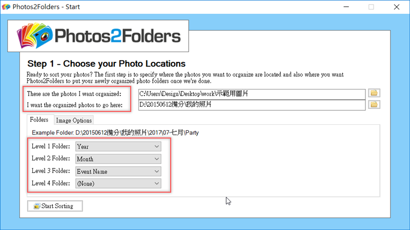 切換到旁邊的選項,有關於使用日期的認定、重複照片的處理,其中「Move files instead of copying」這條,如果相片沒做好備份最好取消勾選,這樣就會幫你用「複製」的方式處理原始資料夾,決定後就點「Start Sorting」。