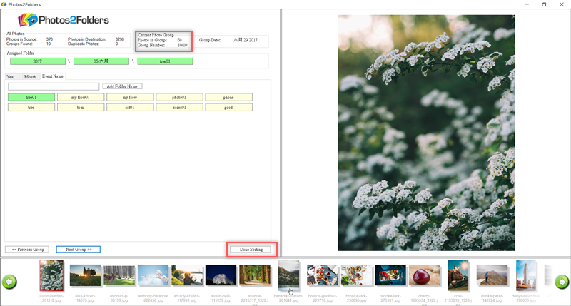 程式判定有 10 批不同時期的相片,所以阿湯按步驟一一命名,最後點「Done sorting」就會開始分類。