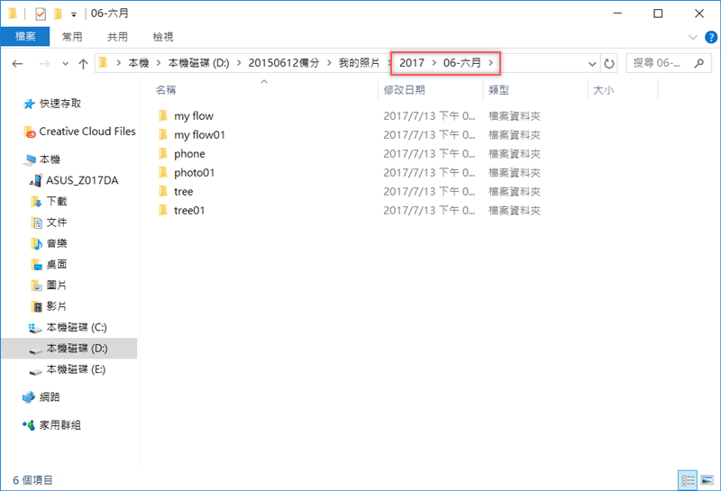 來看看阿湯的處理結果,出現了一個名為「2017」的資料夾,以下分五月及六月,分別點進去是自訂的子資料夾,再點進去才是照片,不過這招只能就資料夾來命名與分類,若要編輯照片名稱建議可使用「