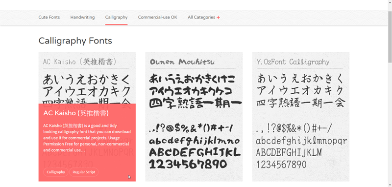 目前收集了 218 種字體,首頁是可愛類別,另外還有手寫風、書法風和可商用的分類。
