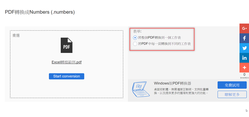 來試試 PDF 轉 Numbers 檔,上傳檔案後,右邊可選擇要轉到同一個工作表或是將每一頁轉到不同的工作表,決定後就按「Start conversion」。