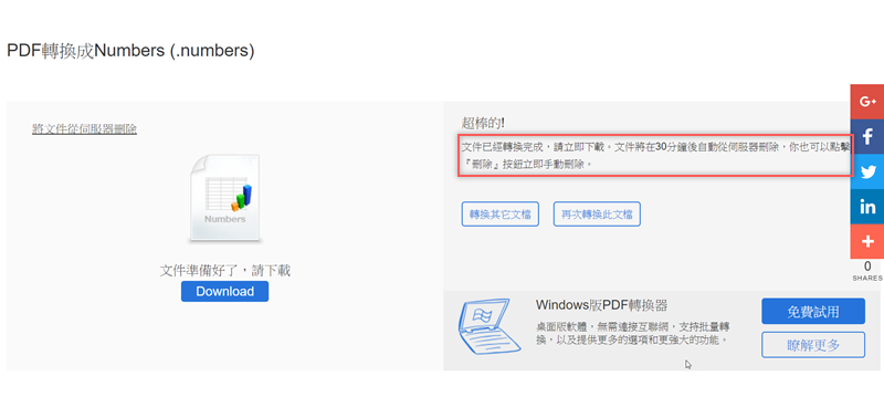 處理速度很快,大概花個 2 秒就轉換完成,應該檔案大小也有影響,可直接點下載,為保隱私 30 分鐘後會自動刪除,也可以手動刪除。