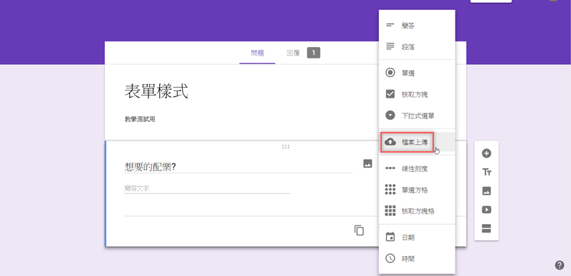 進入表單,點開右方選單選擇「檔案上傳」。