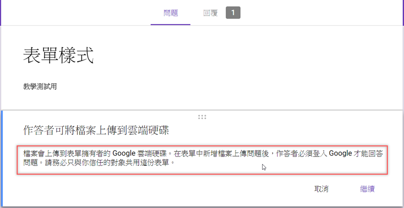 比較麻煩的是,答題的人必須登入 Google 帳號才能使用,所以不適合給沒有 Google 帳號的朋友,點繼續。
