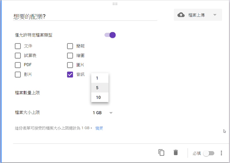 接著可以設定檔案類型(或不設定),共有文件、試算表、PDF 等八種類型可選擇,阿湯選音訊,檔案數量上限只有 1、5、10 可選,無法自訂。
