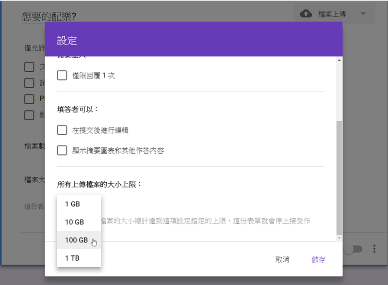 這裡可調整回覆次數、填答者權限等,還可設定所有人上傳的檔案大小上限,免得硬碟空間不足。