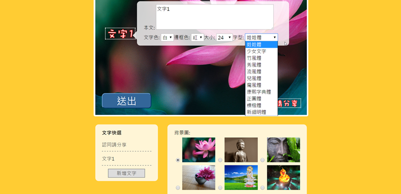 阿湯就來用自己拍的食物照片,選擇康熙字典體,配好顏色、大小按送出。