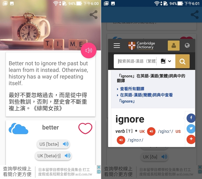 單字部分以發音為主,點「詳細」才會看到翻譯,頁面比較不會那麼雜亂,預設的語速蠻快的,建議在「設定」的地方更改。