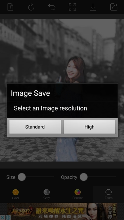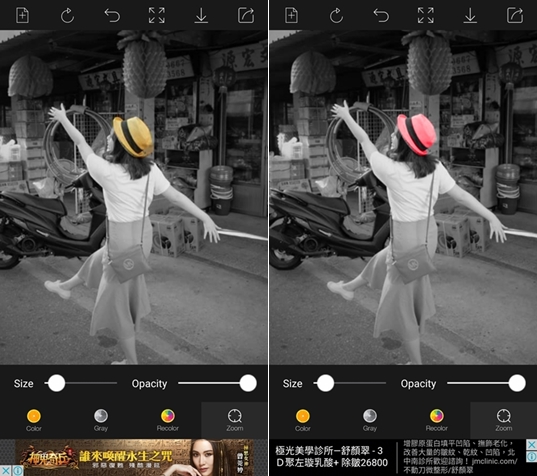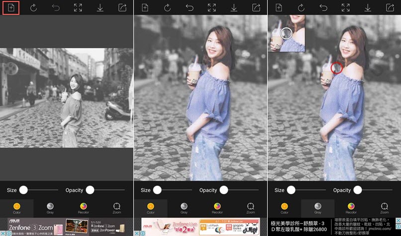 開啟後會先有示範圖,可以直接略過點左上角加號加入或拍攝照片,置入後馬上變成黑白照,下方可調整筆刷大小與透明度,再用手指塗出要顯示的部分。