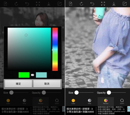 還可加入其他顏色,例如阿湯想將這杯珍奶變成薄荷綠,一樣選擇顏色再放大塗抹即可,塗太出來就切換到黑白區修改。