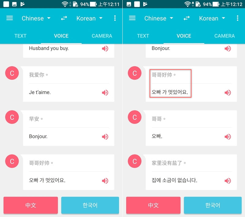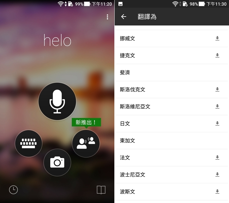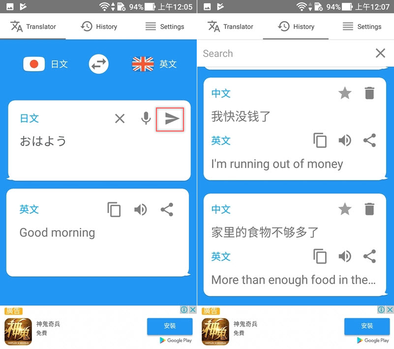點麥克風說話後一樣要再送出才會幫你翻,也是有歷史紀錄可檢視,比較討厭的是點「中文」只有簡體中文。