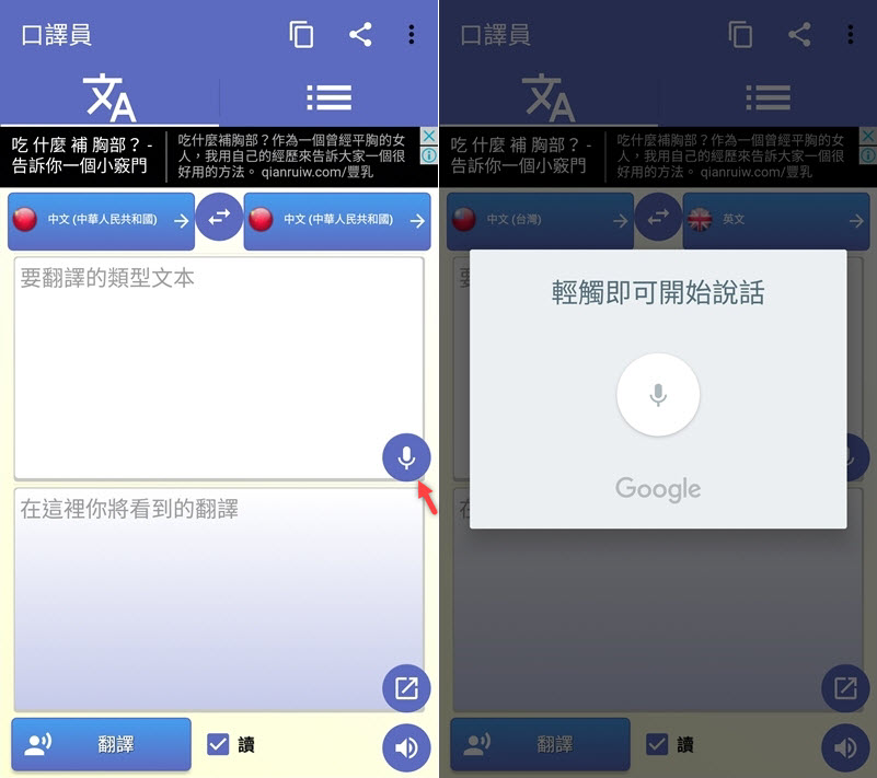 點右下角麥克風說話,說完會先顯示在上面,要再點左下角「翻譯」才會幫你翻,也是用 Google。