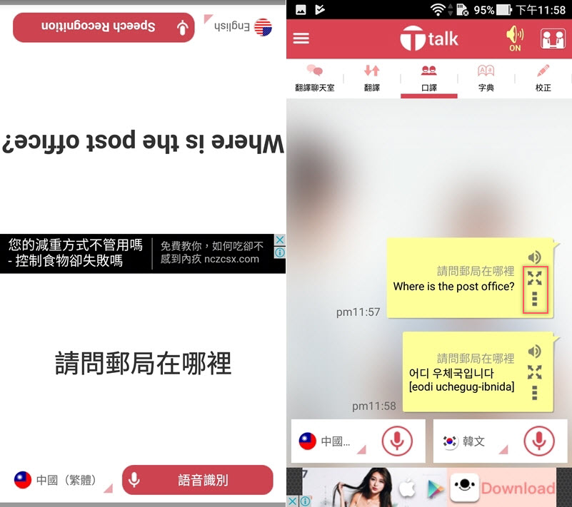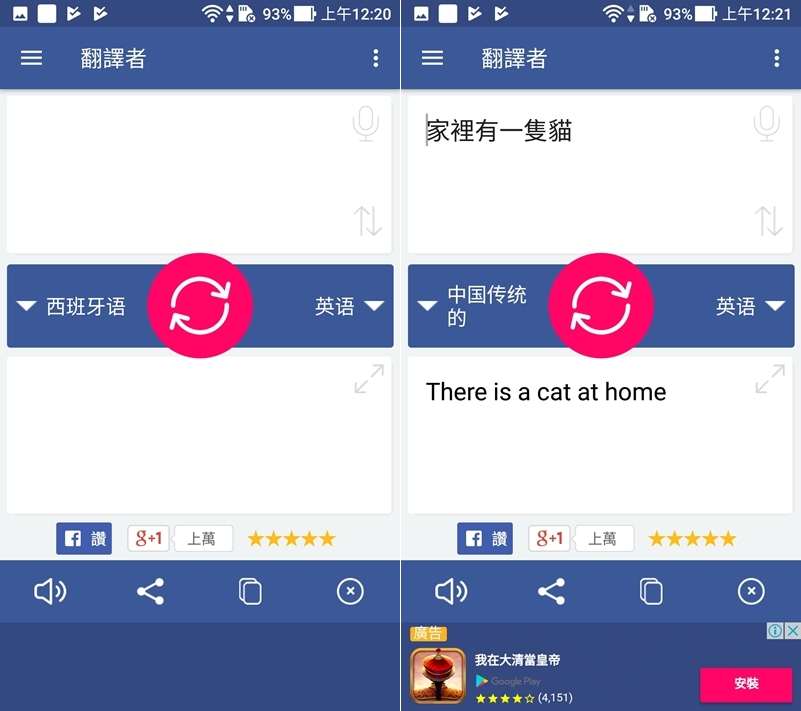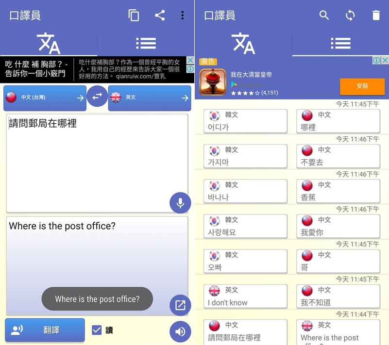 這款支援的語言沒那麼多,但語言旁還會標示國家,左邊說一句之後,右邊改成其他語言就會自動再翻一次,介面簡單且難得沒有廣告。