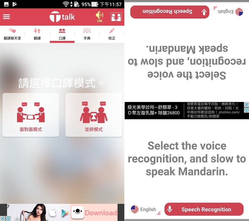 直接進入口譯功能,先選擇要面對面還是並排模式,像面對面就可以你說一句對方說一句。