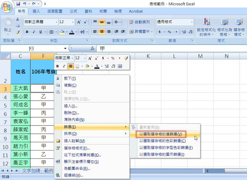 先來看預設的篩選方式,下面這個考績表共 15 人,假設我只想知道考績甲等的是哪些人有幾位,就在隨便一個「甲」的儲存格按右鍵篩選 → 以選取儲存格的值篩選。