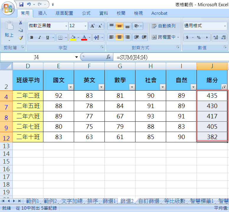 出來就是高於平均分的幾個班級了,由於只是篩選並沒要求排序,所以不會自動依分數排好,而是會依原本表格內的班級順序來顯示。