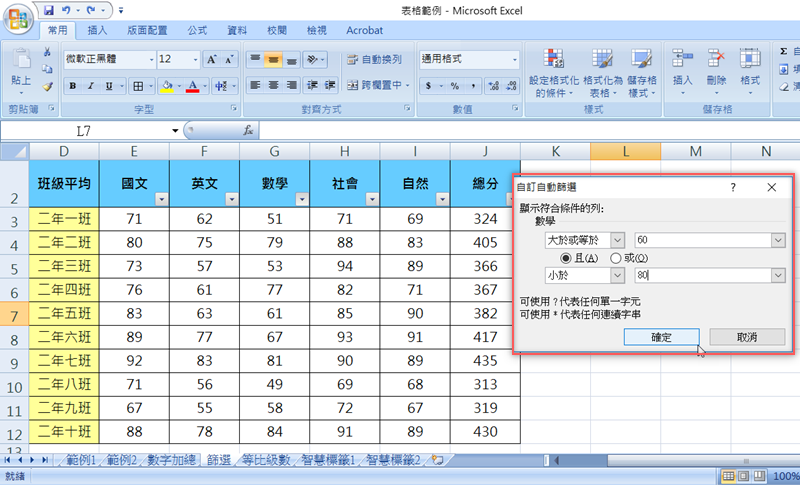 如果要知道分數及格但不滿 80 分的是哪些班級,通常是 60 分及格,就在第一個條件選「大於或等於」並填上 60,再點「且」,設定第二個條件是「小於」並填上 80,點確定。