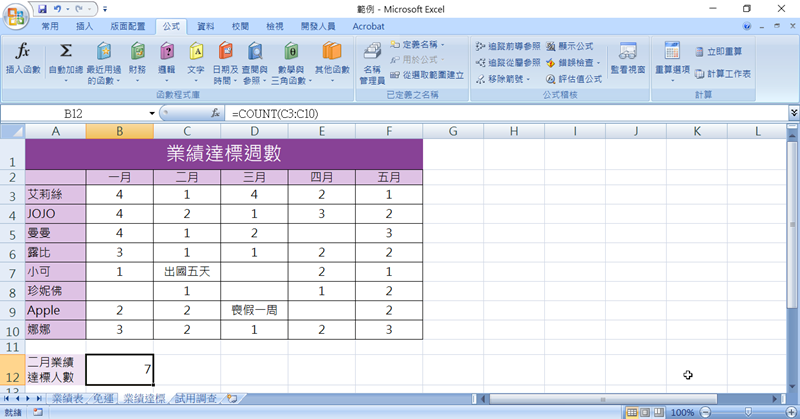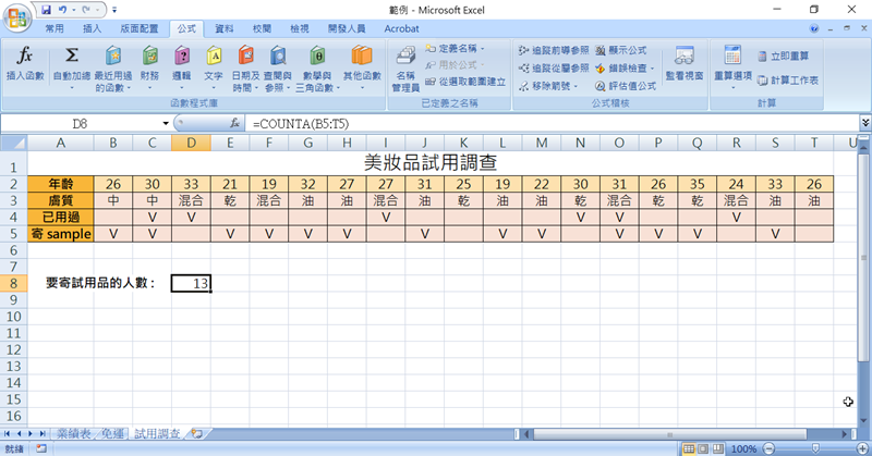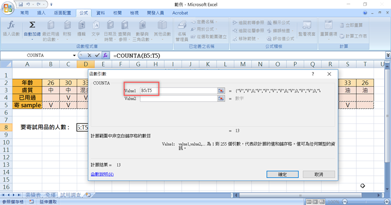 這次來算要寄試用品的人數,輸入範圍「B5:T5」,按確定。