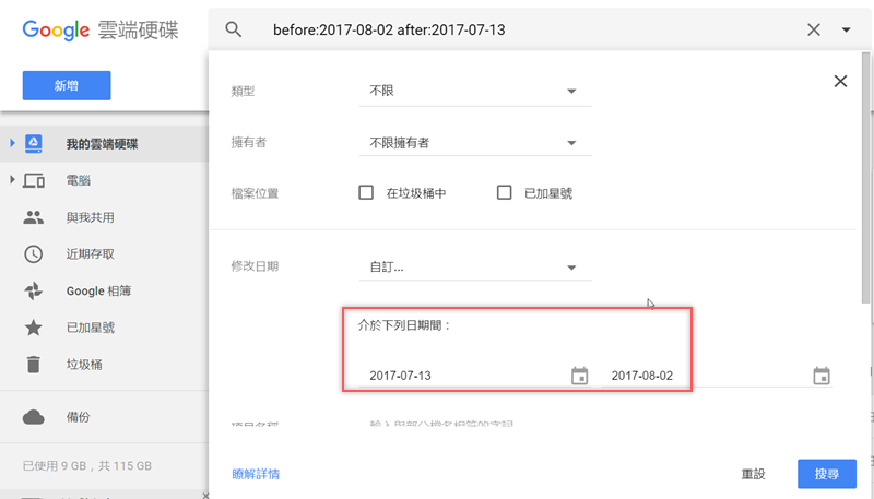 點開上方搜尋列的倒三角形,這裡可以看到不少條件可設置,基本的檔案類型、擁有者(自己還是他人建立)、檔案位置先試試看。