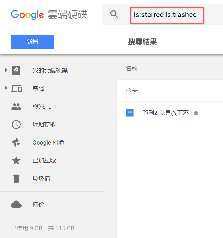 或是用「已加星號」的項目,輸入「is:starred」結果出現在垃圾桶,如果你的檔案很重要,記得加星號,找起來也比較快。