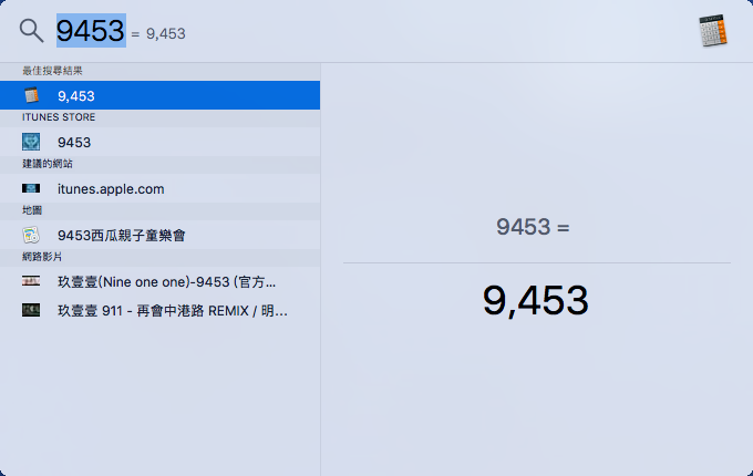 點桌面右上角的放大鏡,叫出 Spotlight 後輸入想查詢的內容,例如阿湯輸入「9453」,會出現在 iTUNES、地圖、和影片的搜尋結果,但這並不是阿湯要找的內容。