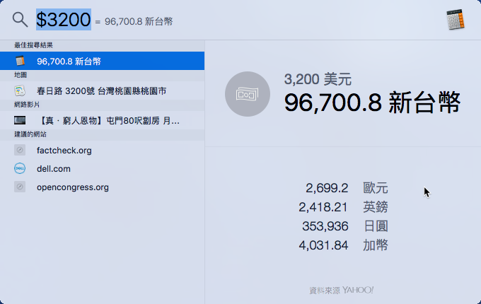 或是在數字前加上美元符號「$」,就會很聰明的幫你轉換匯率,以台幣、歐元、英鎊、日圓、加幣這四種常用的幣值為主。