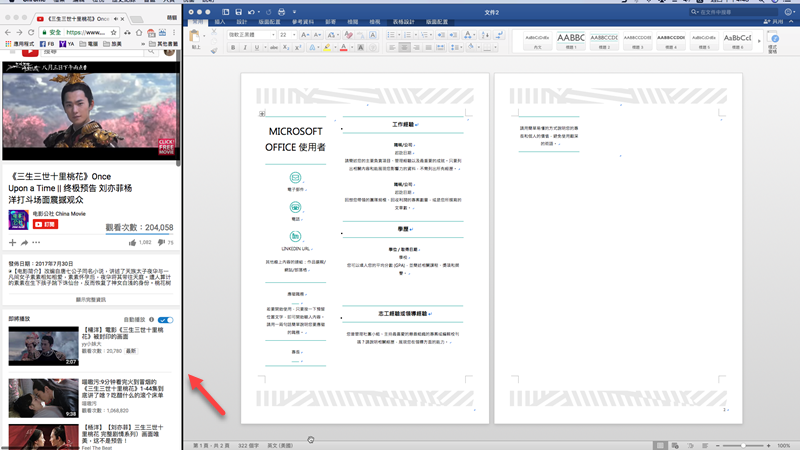 分割螢幕功能阿湯也覺得很好用,打開要處理的視窗按住左上角綠色按鈕,可以將它拖到螢幕的左邊或右邊,然後再拖進另一個,顯示面積也可拉中間的分隔線來調整,像阿湯就可以邊看 YouTube 邊打資料,享受雙重視窗。