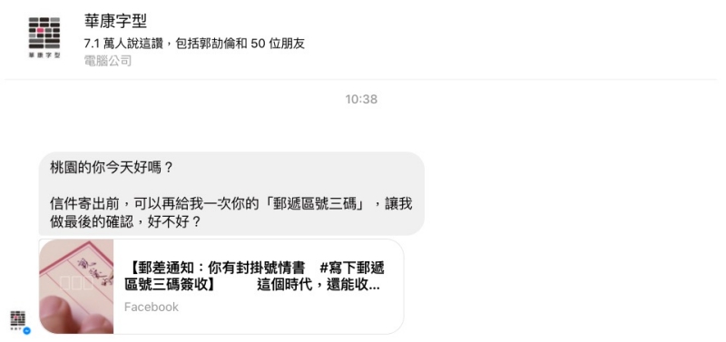 其實這樣的自動回覆機器人已經很多了,不過做的有趣的不多,華康字型善用他們手寫字型的特點,做出了這個情書機器人,真的蠻有趣的,只要到他們粉絲團這一則訊息下留言你的「三碼郵遞區號」,就會馬上私訊你。