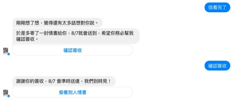 說是 8/7 還會有情書,確認簽收就對了,就等看看 8/7 會再寄什麼來。