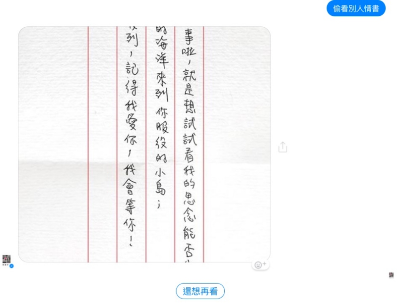然後阿湯就又收到一封了,是不是太文藝了一些,「想試看看的的思念能否穿越遙遠的海洋來到你服役到小島」,估計這應該是離島有軍營的縣市吧,大家一起來分享都收到了什麼吧。
