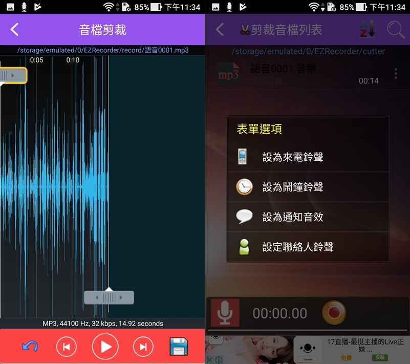 也有剪裁功能,完成後可直接設成鈴聲或通知音效。