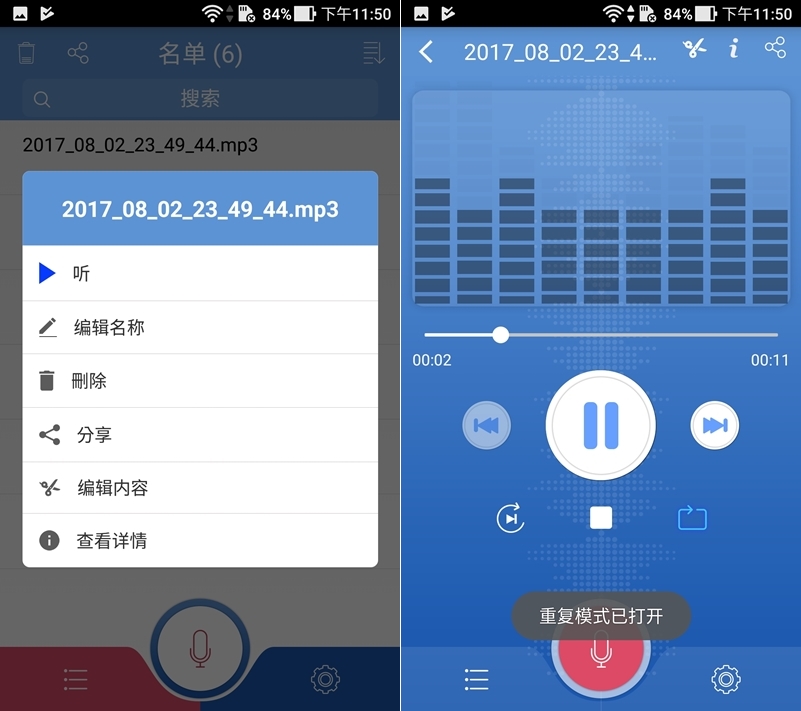 這款全中文可能比較親民(雖然設計有點醜)首頁有錄音列表、剪裁音檔列表與本地音樂選項,點錄音列表進入。