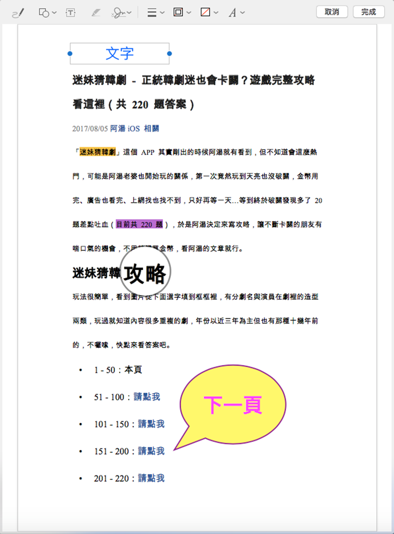再來可加入箭頭、矩形或其他形狀,阿湯是加入一個對話框,然後再使用放大框將「攻略」兩字放大。