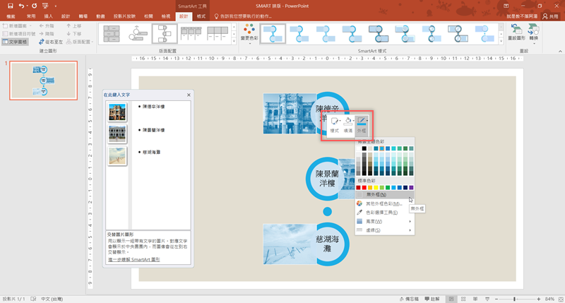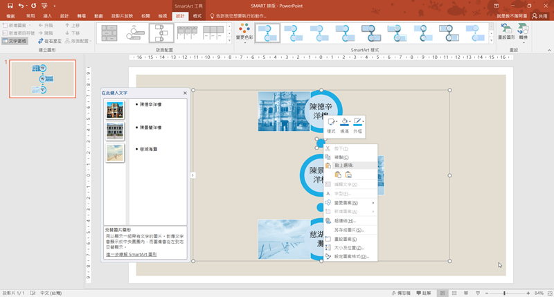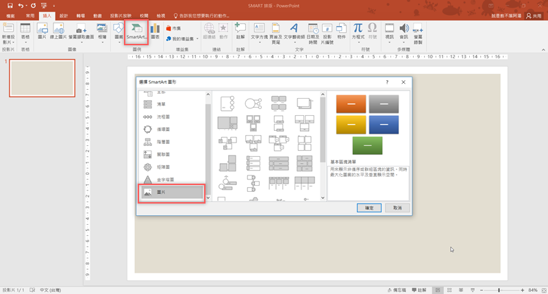 開啟檔案後從上方插入 → SmartArt → 圖片。