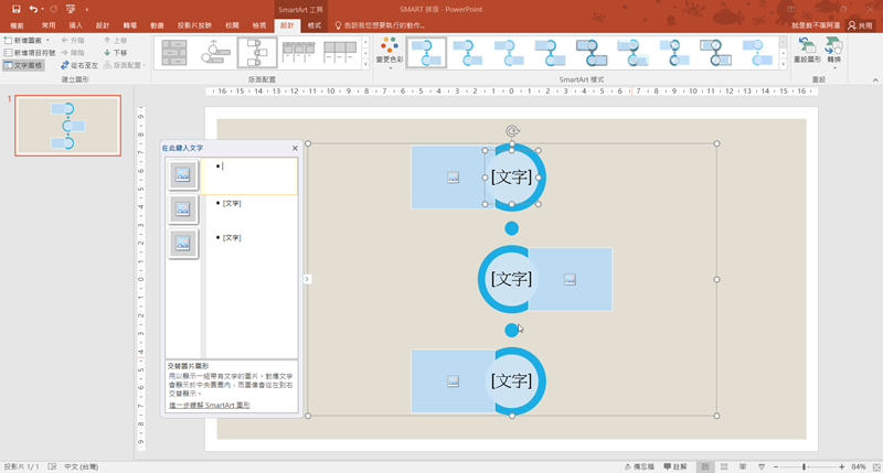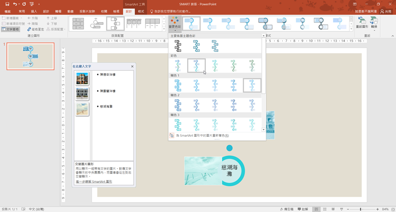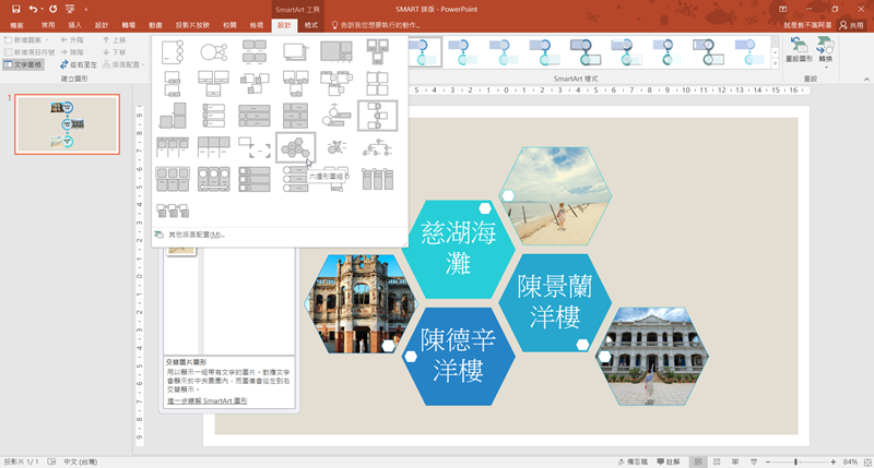 再來如果覺得版型太醜想要改的話,看到上方的 SmartArt 工具,在設計的地方可重新選擇,滑鼠滑過預覽覺得 OK 就換它吧,阿湯換這個六邊形圖組是不是更好看呢。
