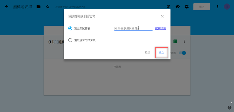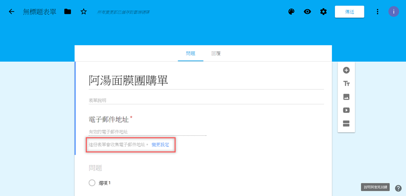 先建立表單,阿湯是設一定要填電子郵件才能送出。