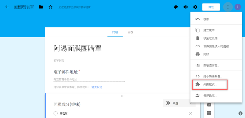 阿湯最近發現越來越多人使用 Google 表單在做網路購物,可能是一般大型購物中心都有門檻不然就是要繳刊登費,不如用臉書或 Line 來得親民又方便,昨天看到有人在搶購面膜,但每種成分的庫存數量都不一樣,例如薰衣草最受歡迎容易缺貨,賣家當然會希望網友們沒搶到薰衣草還可以選別的,這時我們除了設定表單是單選題,還要限制每個項目的被選次數,讓大家在填單的同時看到的都是最新資訊,以免發生糾紛。