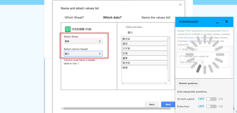 然後就會自動開啟一份試算表,在底下加入一個新標籤並命名,假設叫「整理」好了,並在表頭輸入顯示、選項、額滿顯示、已選數量、數量上限。