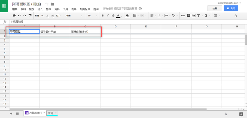 而「表單回應 1」到時會放有填寫的人員資料,包含時間戳記、電郵地址和選擇的香味共三欄,待會要注意的是 C 欄。