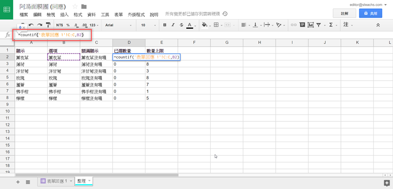 回到整理頁籤,在儲存格 D2 輸入函數「=countif('表單回應 1'!C:C,B2)」,表示我們要計算範圍的是表單回應 1 的「整個C 欄」所以變數為「C:C」,而 C 欄的內容將會傳回到「整理」工作表的「已選數量」欄位(更多函數用法請見