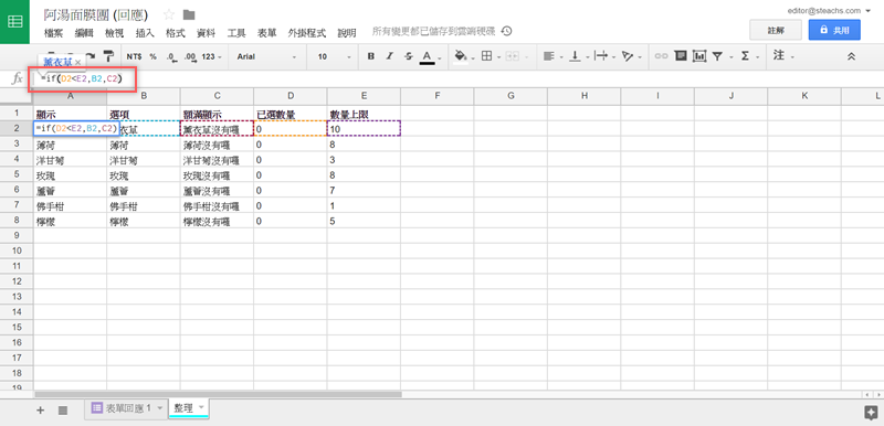 接著在儲存格 A2 輸入「=if(D2<E2,B2,C2)」,代表如果已選數量小於上限則顯示選項的值,否則就會顯示額滿的訊息,輸入完畢一樣下拉填滿。