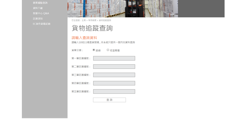 查件分路線與低溫零擔,只提供一個月內的資料。另外還有常溫、低溫、與醫藥的倉儲服務,以及全省長途貨車運輸。