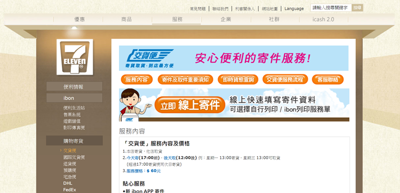 7-11 交貨便分國內外、退貨、預購跟宅急便(黑貓),還有 DHL 文件袋及 FedEx 便利寄,交貨便為店到店取貨,可自行列印或用 ibon 列印貨單,價格 60 元(體積與重量均有一定範圍)。