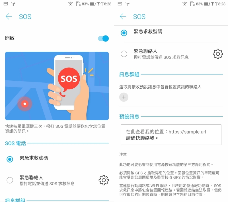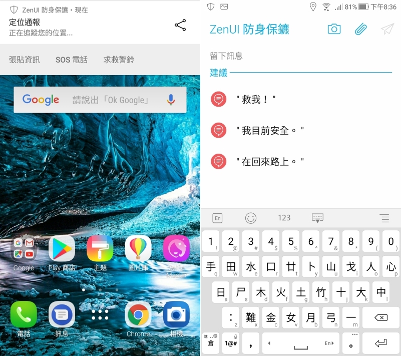 手機現在不僅是用來上網、滑 FB 或是玩遊戲,像是電影情節中的遇難救援,透過手機偷偷的發訊息求救等,現在則是不用那麼麻煩,ZenUI 直接加入 SOS 功能,只要設定好防身保鑣,預先加入緊急聯絡人,當你遇到狀況時,只要按三下電源鍵,就會打電話並發送簡訊到你設定的聯絡人,並提供你目前所在的位置。