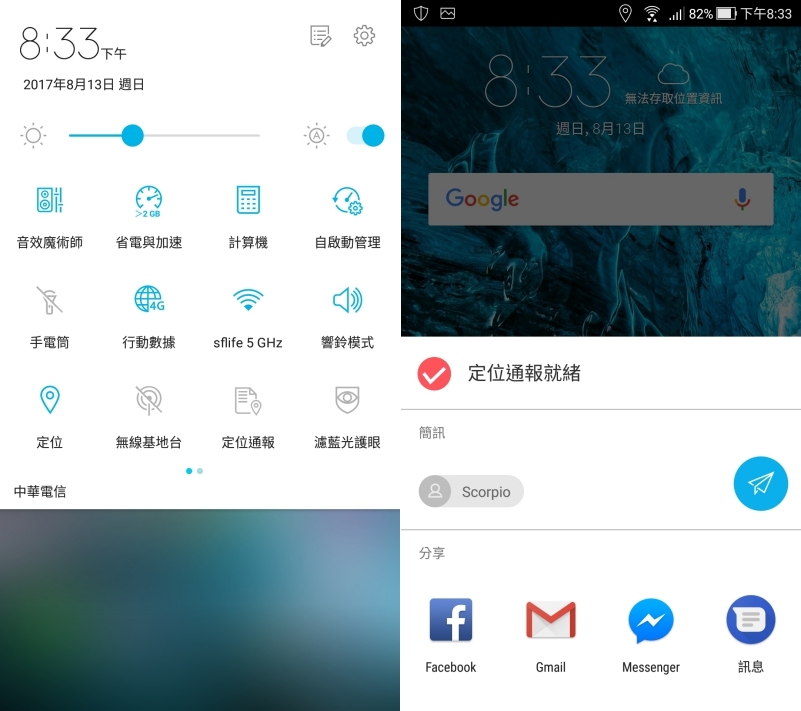另外也能透過定位通報的方式,同樣設定好接收資訊的聯絡人,之後只要下拉通知欄,按下定位通報,就會透過簡訊發送你目前的位置資訊給對方。