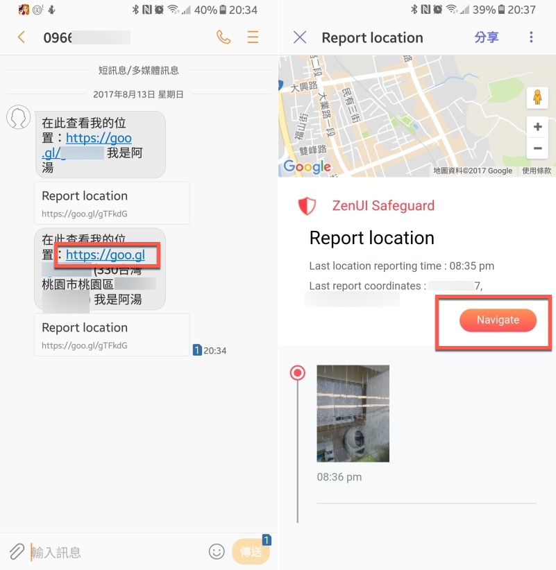 當對方收到簡訊時,會像這樣,提供位置資訊及連結,點擊後可以查看你留下的文字訊息、照片及詳細的位置,按下 Navigate 還可以直接利用 Google Maps 導航前往。