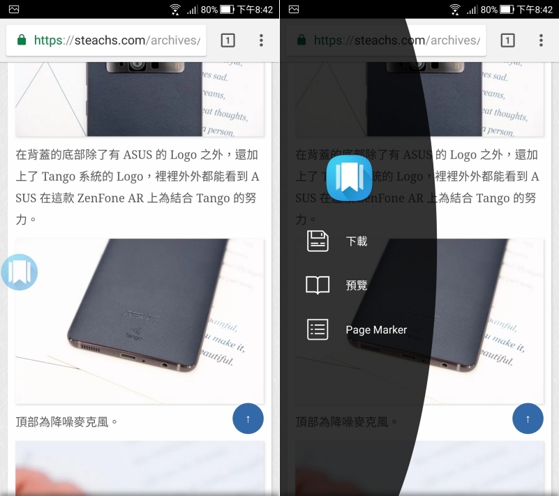 在瀏覽網頁時,現在多了 Page Marker 的功能,可以將目前的頁面直接下載離線儲存,就不用急著當下要把網頁看完,可以先儲存後,事後再慢慢瀏覽。