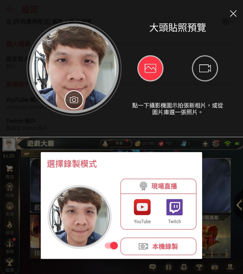 如果喜歡直播遊戲和大家分享,但自己的畫面如果很暗或者不方便露臉,現在也可以自定大頭照的頭像,不一定要再使用前鏡頭即時的放送自己了。
