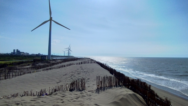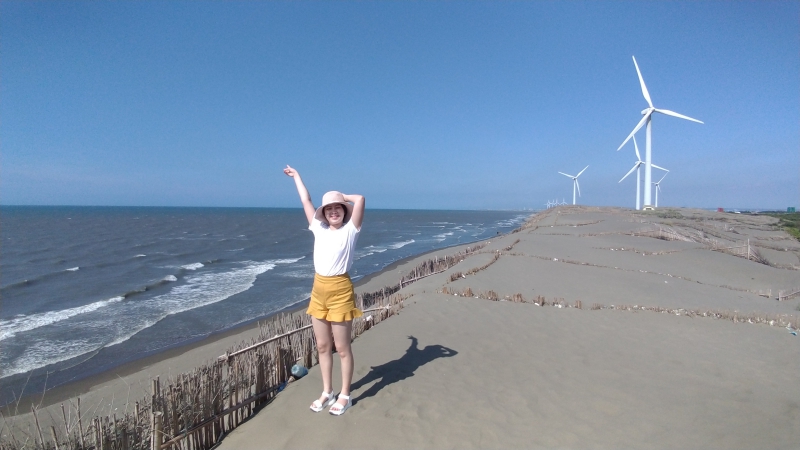 在用餐後,我們跑到桃園觀音的海邊,有個「草漯沙丘」之稱的地點,不過這一望無際的藍天真的好熱啊。